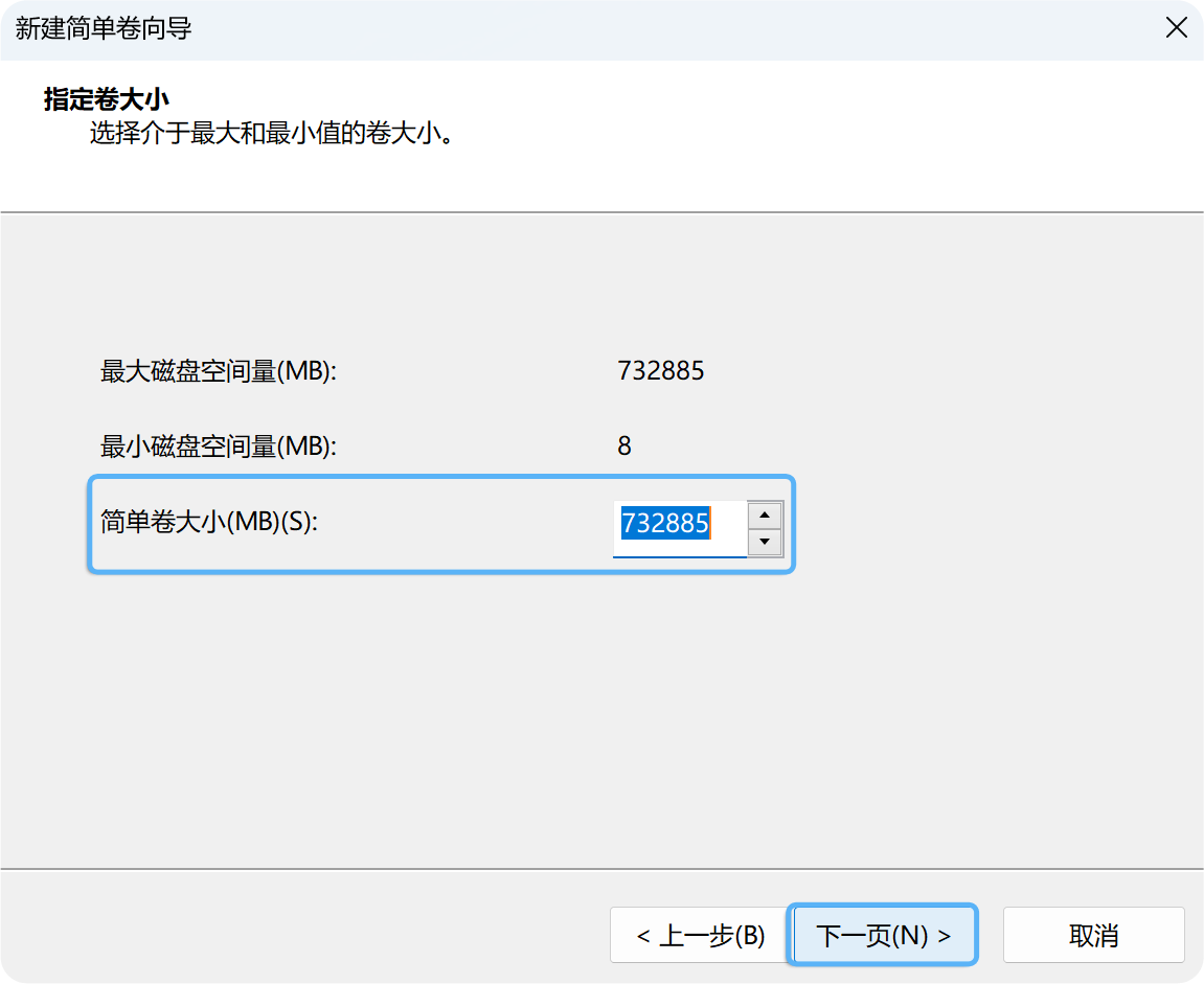3. 指定卷大小:默认显示最大可用空间,可按需调整(需介于向导提示的 “最大 / 最小磁盘空间量” 之间),点击【下一步】;