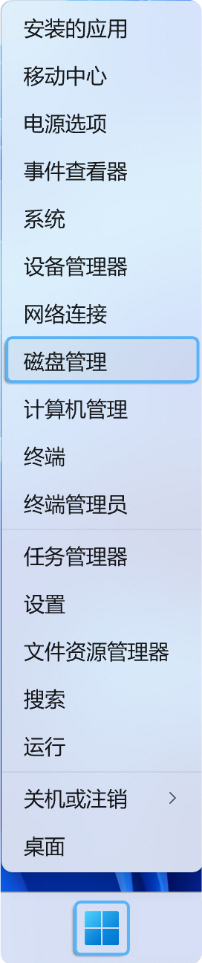 方法 2:同时按下【Win + X】组合键,在弹出的菜单中选择【磁盘管理】。