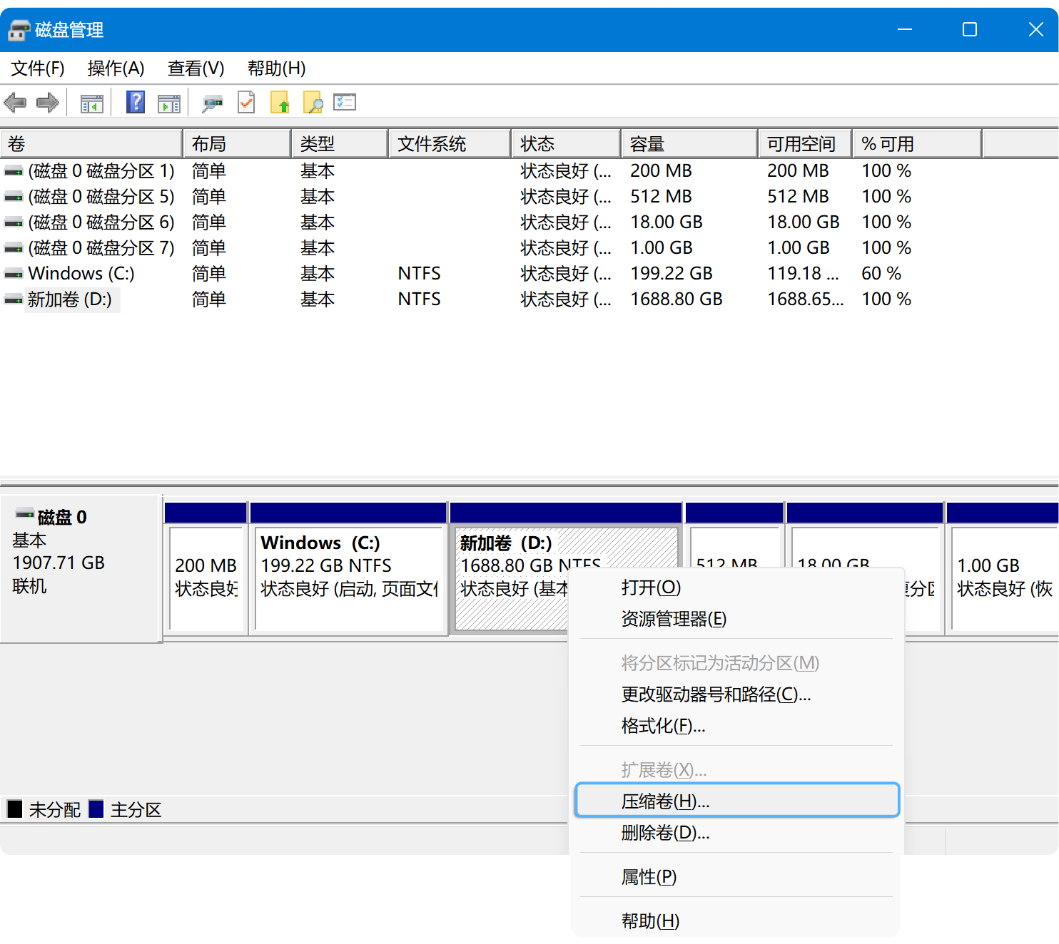 3. 右键点击该磁盘的目标分区(如 “新加卷 (D:)”),选择【压缩卷】,系统会自动查询可压缩空间。