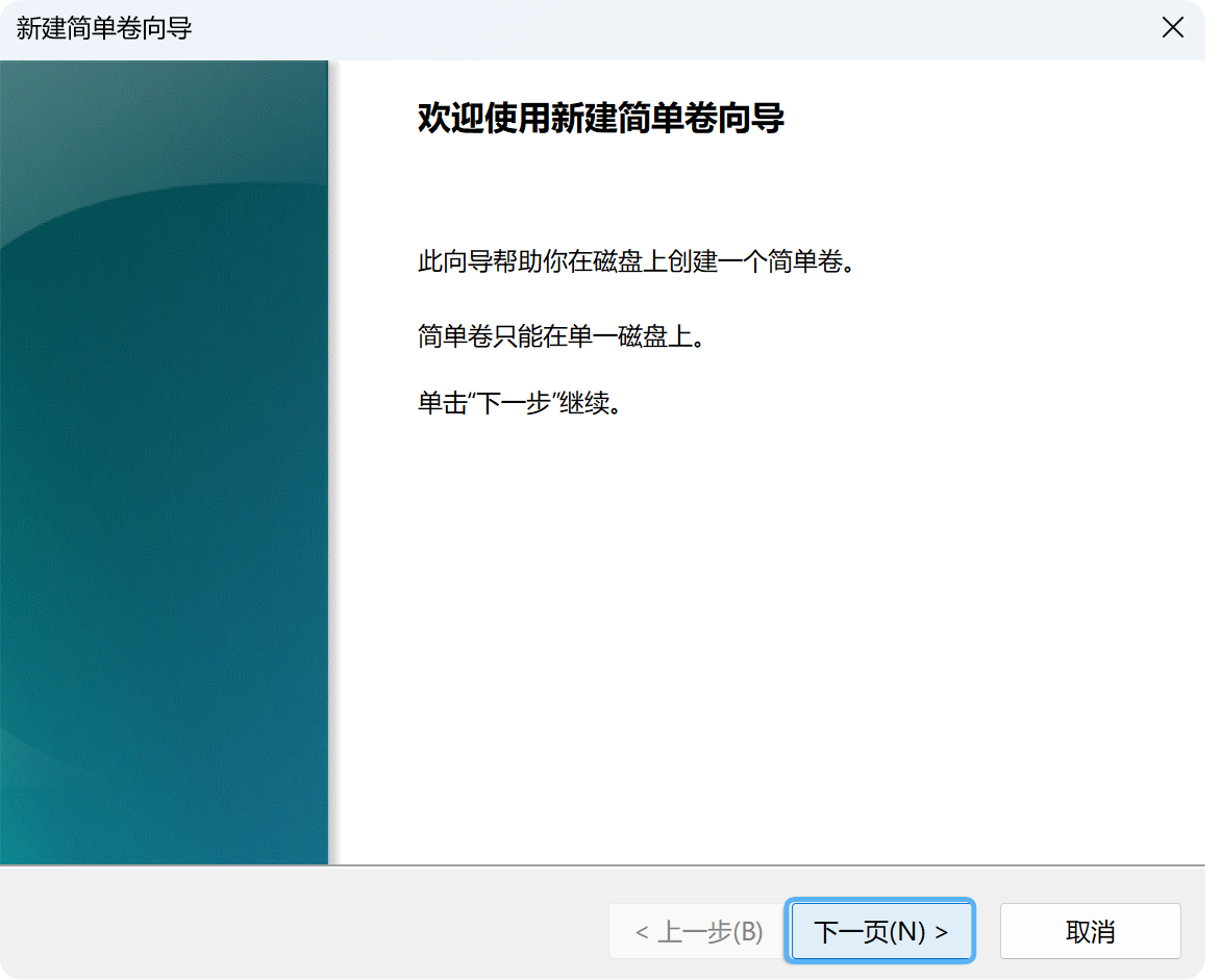 2. 弹出 “新建简单卷向导”,点击【下一步】;