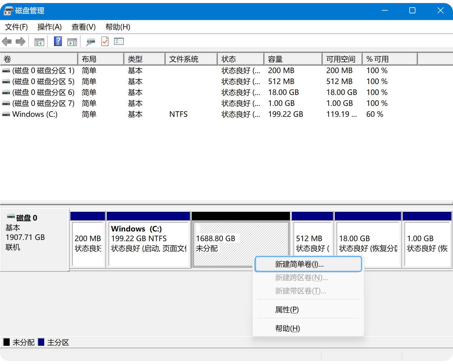 1. 右键点击压缩后出现的 “未分配” 空间,选择【新建简单卷】;