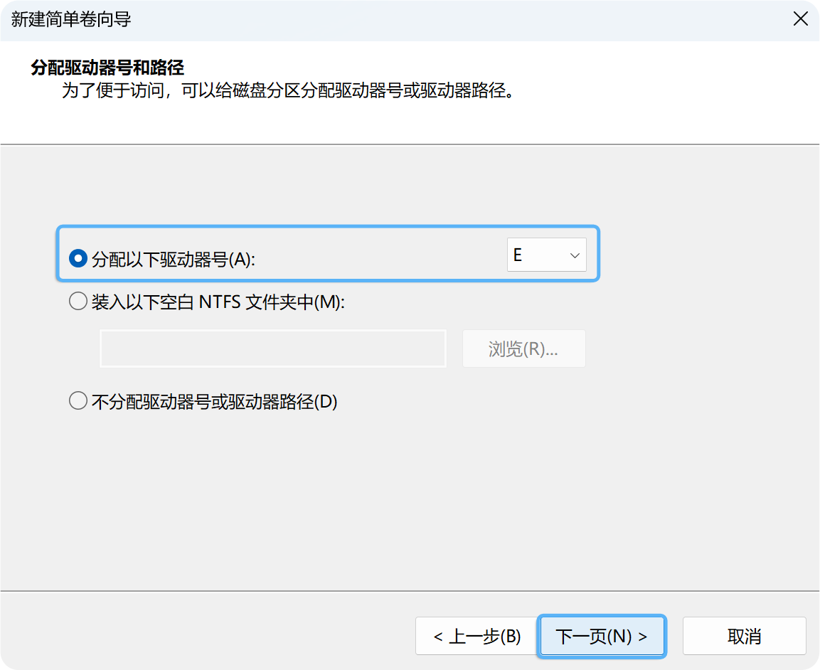4. 分配驱动器号和路径:选择 “分配以下驱动器号”(默认会自动分配,如 “E:”),点击【下一步】;