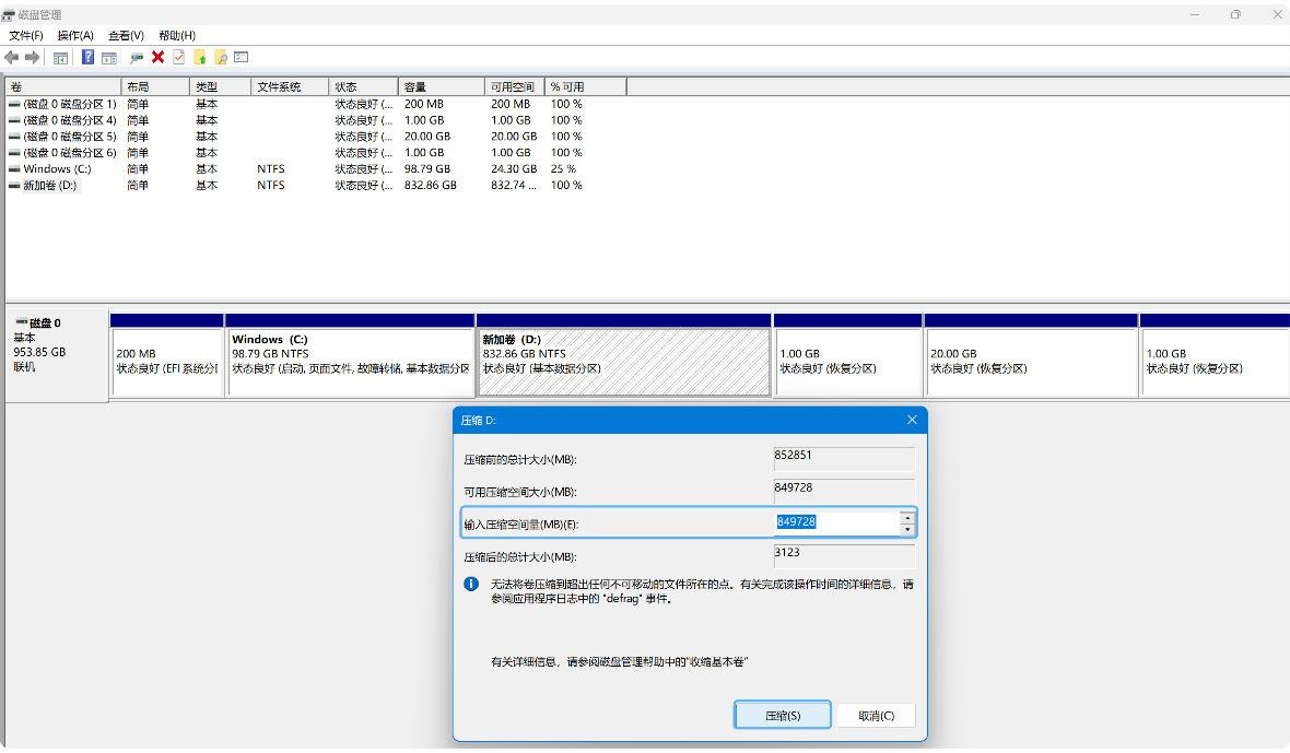 2. 点击【压缩】,等待系统完成压缩(压缩后会出现 “未分配” 空间)。